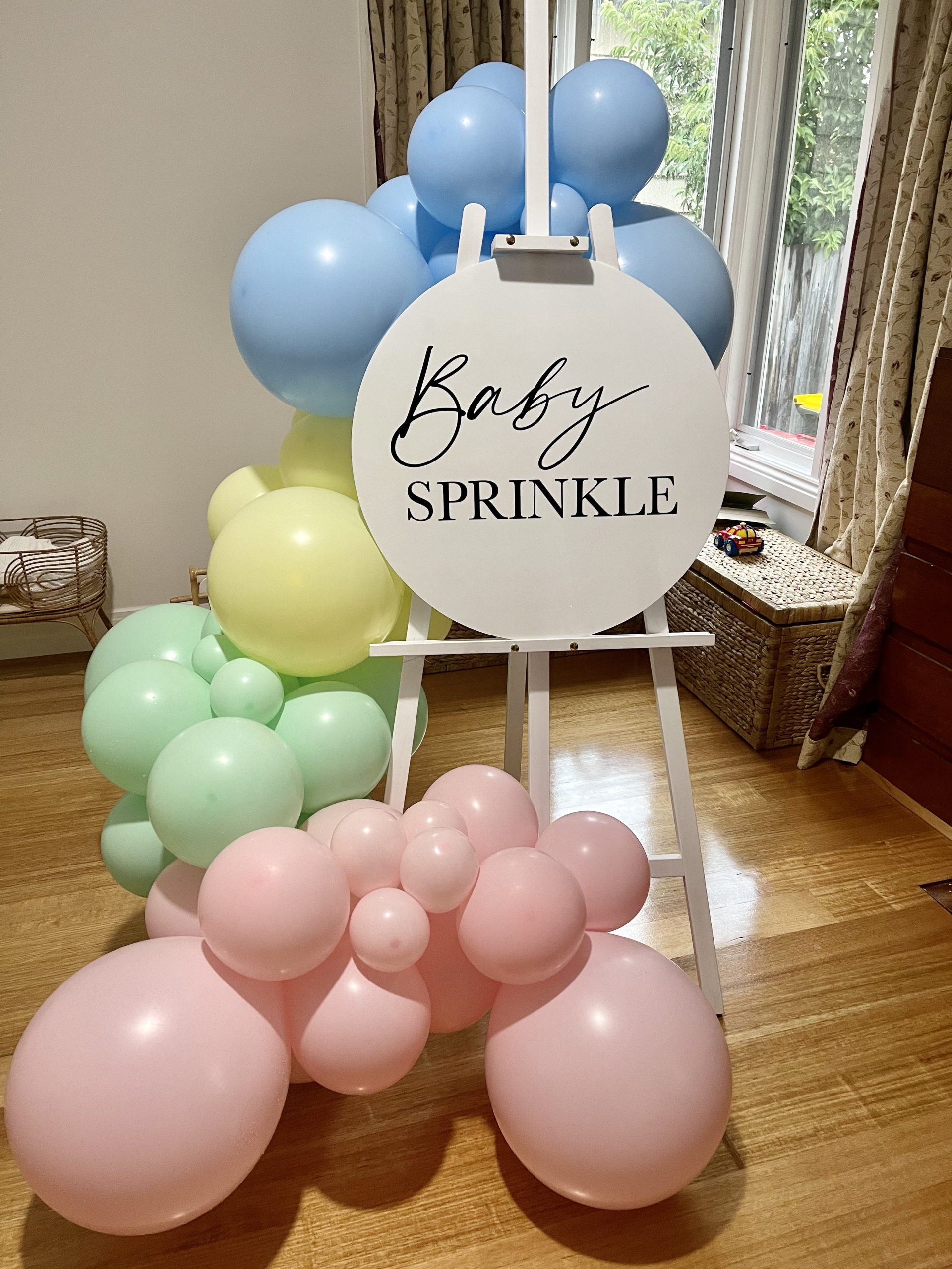 Perfect for birthdays, baby showers, bridal showers, or any special celebration, this eye-catching setup combines personalised signage with a vibrant balloon garland to make a statement right from the entrance.